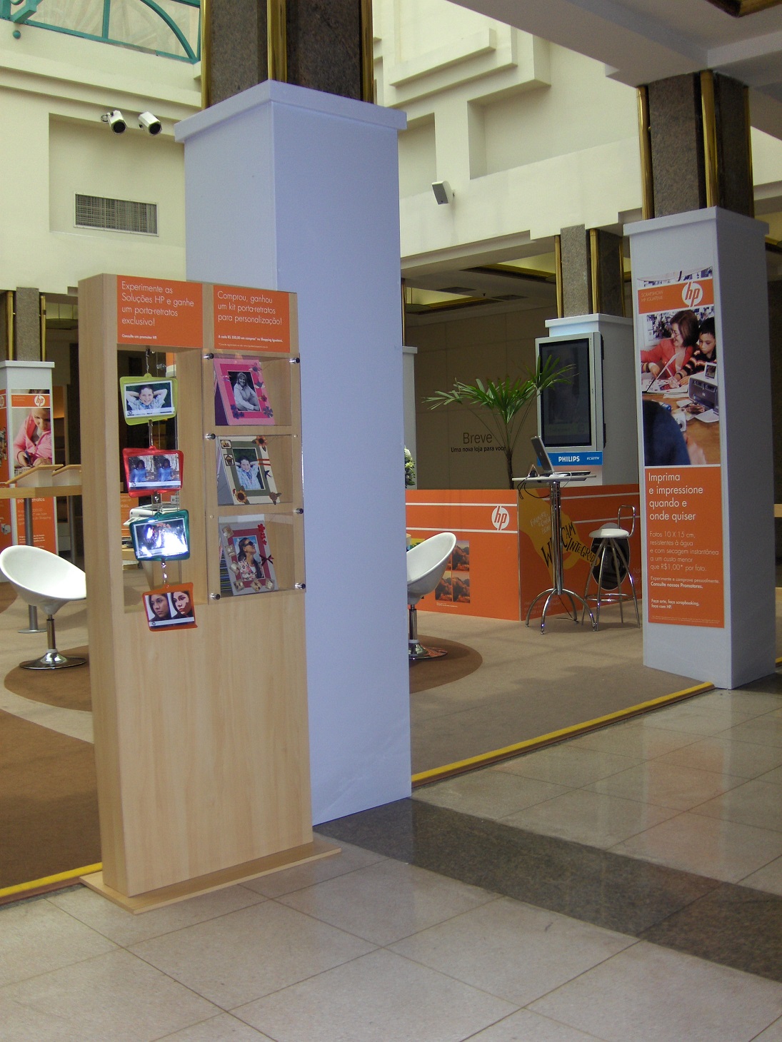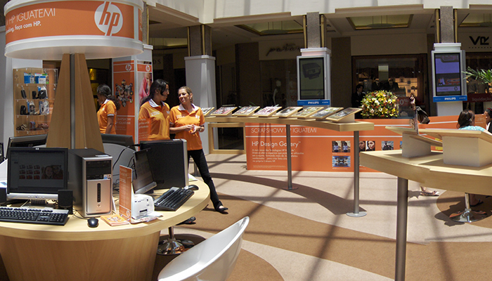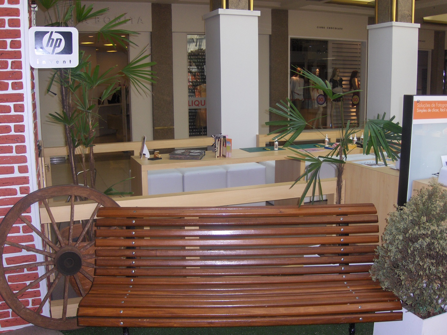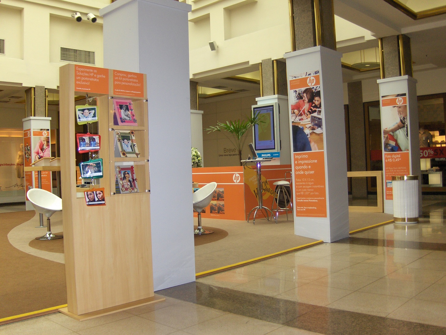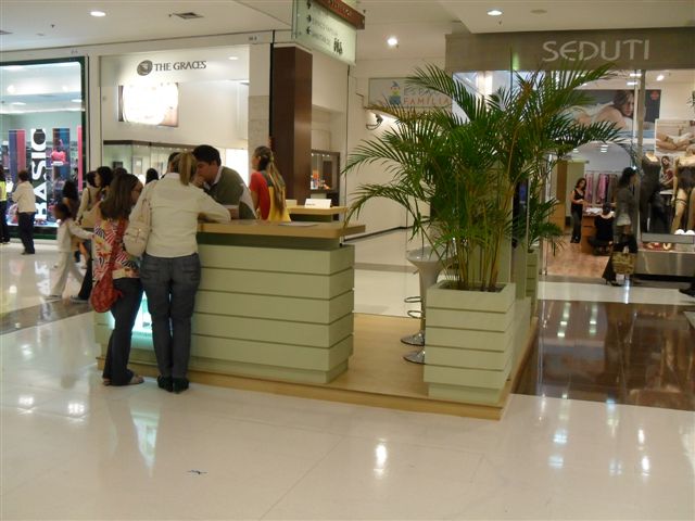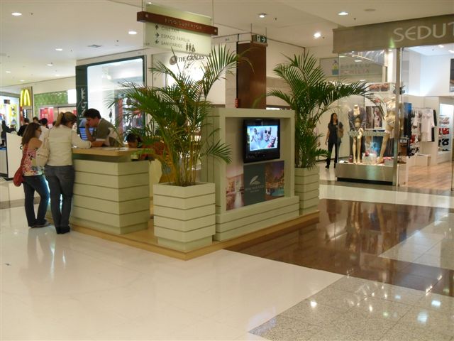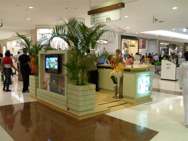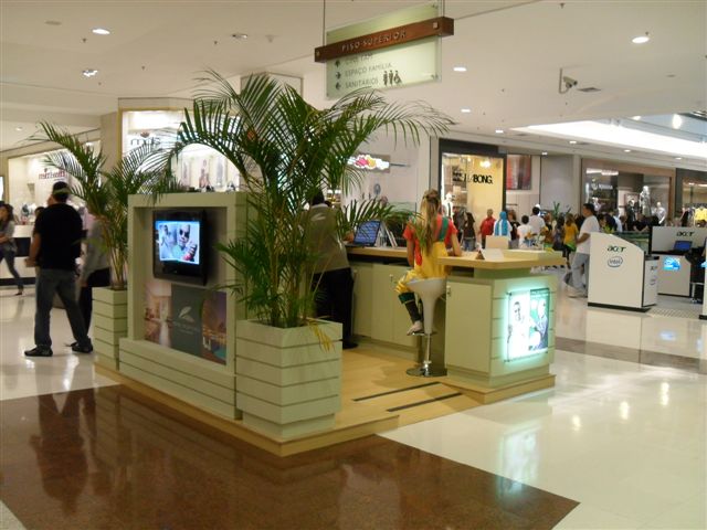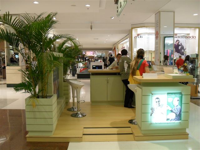 Espaço de convivência com exposição de produtos e mobiliários no Barra Shopping, Rio de Janeiro.