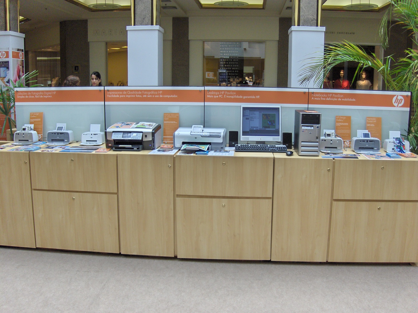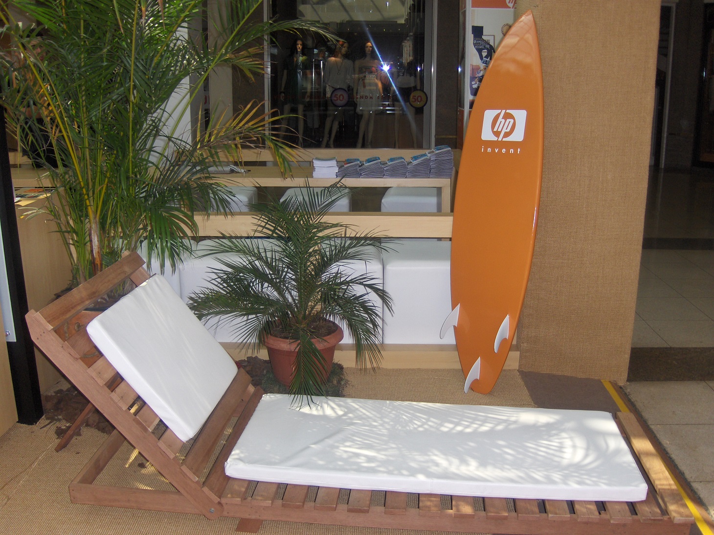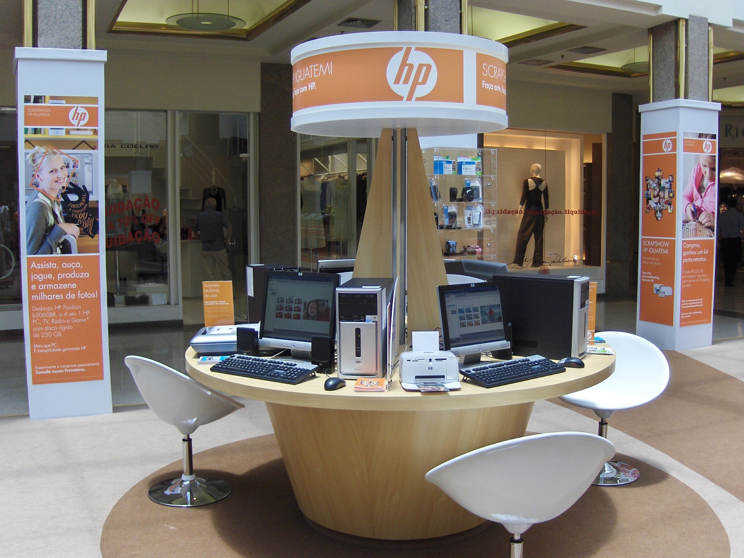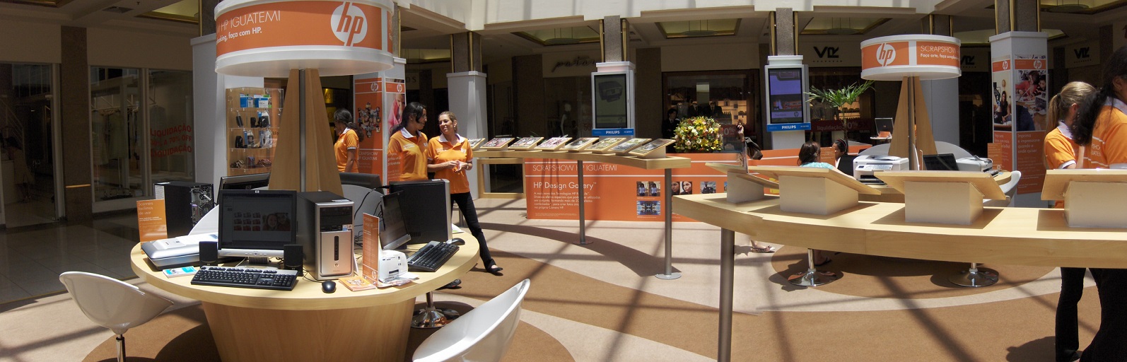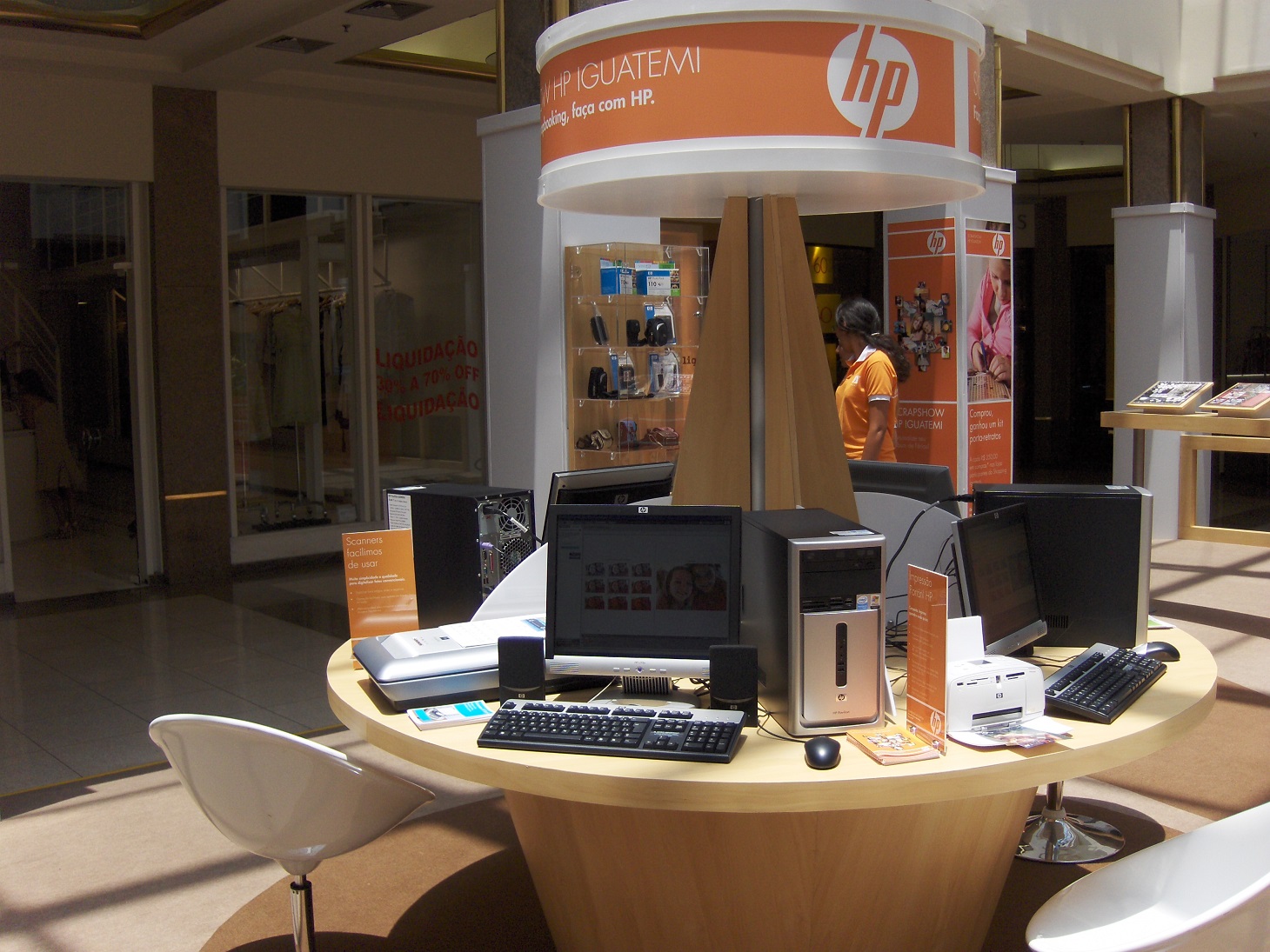 Espaço de convivência com exposição de produtos e mobiliários no Barra Shopping, Rio de Janeiro.